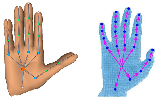 (left) SynHand5M [21] dataset hand model; and (right) bone vectors and joints of BigHand2.2M [46] dataset hand model.