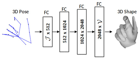 Architecture of the proposed linear 3D hand shape decoder (Module 2), which estimates the dense 3D hand mesh representation (shape) from the given sparse 3D joint positions (pose).