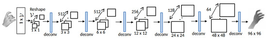 As discussed above, weak-supervision is an essential component of our pipeline due to the missing shape ground truth of real images. We provide a source of weak-supervision on shape learning by utilizing the input depth image and synthesize from the reconstructed , as shown in Figure 2. Inspired by the approaches proposed in [30,45], which synthesize a depth map from sparse joint positions, we build the architecture for our depth image synthesizer to generate depth image from richer dense mesh representation, as shown in Figure 5. It consists of six deconvolution layers, which use ReLu as activation functions, except the last layer that uses tanh. The sizes of the 2D feature maps increase gradually but decrease in number until of size is finally synthesized. The kernel sizes for the deconvolution layers are , , , , and , respectively. We use standard L2 norm to minimize the difference between the synthesized and ground truth as: