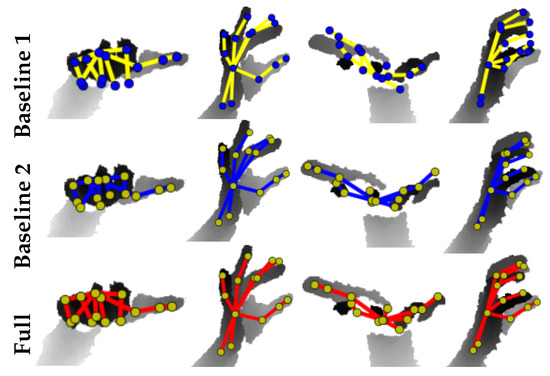 Self-comparisons: To rigorously evaluate our algorithm, we performed self-comparisons of our baseline architectures and Full model on real NYU dataset. The networks were jointly trained with combined NYU, BigHand and synthetic SynHand5M datasets and optimized for the loss given by Equation (9). We used the hand model of Zhou et al. [10] for implementing the bone-to-joint layer. Baseline 1 is similar to the CNN architecture proposed in [31], which we use to directly regress . Table 3 shows the joints estimation accuracy of Baseline 1. Baseline 2, which incorporates hand skeleton structure (see Section 4.1), achieves a % increase in pose estimation accuracy. Since is included in Baseline 2, the 3D bone error is also reported in Table 3. Baseline 3 includes hand mesh learning, which marginally improves the pose estimation accuracy by % and bones estimation accuracy by % over Baseline 2. Our Full model shows the best accuracy on joint positions and bone vectors estimations by including Module 3 in training. Figure 10 (left and middle) illustrate quantitative results of the self-comparisons. The curves that cover the most area achieve the highest accuracy. Qualitative comparisons of Baseline 1, Baseline 2 and the Full model are shown in Figure 11. Furthermore, we quantitatively evaluated Model 1 (see Section 6.2), which shows lower accuracy of 3D pose estimation due to inaccurate hand mesh estimation. We compared its performance to our Full model (see Table 2).