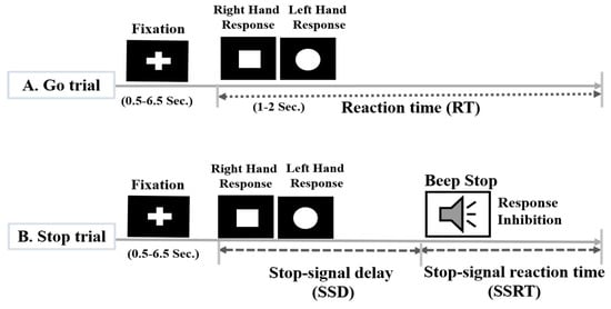 In this study, all subjects performed a stop-signal task or Go/No-Go task []. The stop signal task is widely used to measure the inhibition of the human response and the main task dependent variable, the stop signal reaction time (SSRT), provides an individualized measure of inhibitory control. The participants were presented with a series of Go stimuli they were instructed to respond quickly; for a circle or square shape. They were instructed to press the right button for a square and a left button for a circle, as presented in Figure 1.