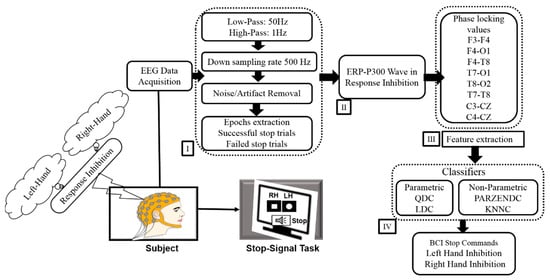 The system architecture of the proposed hierarchical classification model. (I) EEG signal preprocessing steps. (II) Event-related potential (ERP)-P300 wave during LHR and RHR inhibitions. (III) Phase blocking value (PLV) between two EEG signals during LHR and RHR inhibitions. (IV) Parametric (LDA, QDA) and non-parametric (PARZENDC, KNNC) classifiers, which are the most common classifiers used in BCI technologies.