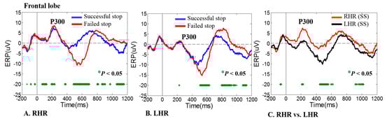 An event-related potential (ERP) of P300 wave was obtained in frontal lobe (FZ) during right-hand response (RHR) and left-hand response (LHR) inhibitions in successful stop (SS) and failed stop (FS) trials. Asterisk display significant difference between SS vs. FS trials by Wilcoxon signed rank test (p < 0.05). (A) An ERP-P300 wave was investigated in frontal lobe (FZ) during RHR inhibition in SS and FS trials. (B) An ERP-P300 wave was observed in frontal lobe (FZ) during LHR inhibition in SS and FS trials. (C) An ERP-P300 wave was found during RHR (SS) and LHR (SS). The X-axis displays time in millisecond and Y-axis shows ERP.