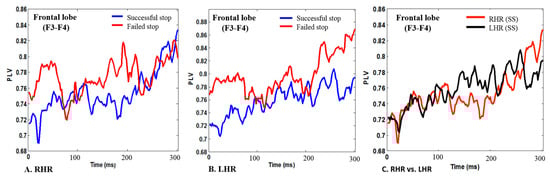 The PLVs were investigated during successful stop (SS) and failed stop (FS) trials in frontal lobe (F3-F4) of the brain. (A) The PLV during SS and FS trials in RHR; (B) The PLV during SS and FS trials in LHR; (C) The PLV during RHR (SS) and LHR (SS).
