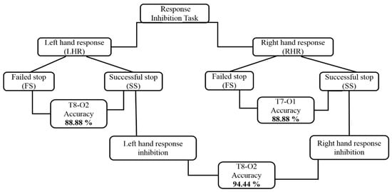 In this work, for the first time we used brain connectivity by phase locking value (PLV) method in eight pairs of electrodes included F3-F4, F4-O1, F4-T8, T7-O1, T8-O2, T7-T8, C3-CZ, C4-CZ, which covered most of the human brain areas related to inhibition, as well as frontal lobe, left motor cortex, right motor cortex, left temporal lobe, right temporal lobe and occipital lobe. We selected these eight brain regions of interest to identify the neural markers of inhibition. We used PLV because this method has revealed the best performance of the classification system. The PLV method has been used as an important feature for the classification of EEG signals []. Our study used the brain connectivity method to hierarchically classify the neural activities of left hand response (LHR) and right hand response (RHR) inhibitions. We hypothesize that this hierarchical model with brain connectivity method will achieve higher accuracy in the brain cortex related to human inhibition, such as the frontal and temporal-occipital lobes. The main impact of this work is the development of a hierarchical classification model to recognize the neural activities of human inhibition in successful-stop (SS) vs. failed-stop (FS) trials. These neural activities can be used as a stop command in the BCI technologies, such as in the stopping of the movement of robotic arm, drone and wheelchair. Also, these neural marker can be applied to recognize the symptoms of ADHD patients in clinical research.
