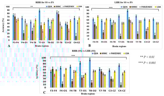 The one-way ANOVA revealed the significant difference in QDA, KNNC, PARZENDC and LDA under LHR for SS vs. FS trials [F (3, 28) = 14.07, *** p < 0.001; Figure 7B]. In addition, one-way ANOVA shown the significant difference in QDA, KNNC, PARZENDC and LDA in [F (3, 28) = 13.61, *** p < 0.001; Figure 7C] during RHR (SS) vs. LHR (SS) trials.