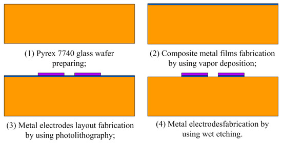 The MEMS process technologies of the glass base mainly involve metal deposition and electrode etching, and the MEMS processes are shown in Figure 3. A Corning Pyrex 7740 glass wafer with 4 inches diameter and 500 μm thickness from Valley Design Corporation (Valley Design Corp, Shirley, MA, USA) is adopted to fabricate the glass base, whose thermal expansion coefficient is close to that of single crystal silicon material. Firstly, composite metal films with 200 nm chromium film and 1 μm gold film are prepared via vapor deposition. Then, the layout of the metal electrodes is fabricated via photolithography. Finally, the metal electrodes are etched by chromium-gold etching solutions.
