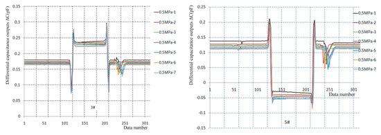 The repeatability tests under laminar flow are implemented at P0 = 0.5 MPa conditions, seven output curves for the 3# and 5# sensor prototypes are separately presented in Figure 12, and their test data are analyzed in Table 4.