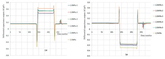 Five repeatability tests under turbulent flow and one shock resistance test are separately implemented under P0 = 2.0 MPa and P0 = 2.5 MPa conditions. The dynamic pressures of repeated tests under 2.0 MPa conditions are in the 31.97–32.23 kPa range, and six output curves for the 3# and 5# sensor prototypes are separately presented in Figure 13, and the test data are analyzed in Table 5.