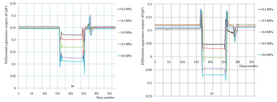 Five dynamic calibration tests under laminar flow conditions are implemented under 0.2–0.6 MPa total pressure, and five output curves for the 3# and 5# sensor prototypes are separately presented in Figure 14, and their test data are analyzed in Table 7.