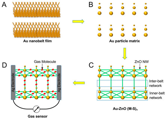 Schematic drawing of the fabrication processes of the Au–ZnO (M-S)n network and the construction of a gas sensor.