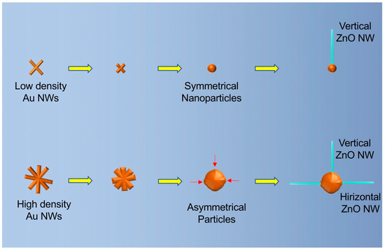 The Au–ZnO (M-S)n network was based on horizontally -rown ZnO nanowires that connect with neighboring gold particles. This behavior of growing horizontally is different from the reports in which the ZnO nanowires were vertically grown. We further studied the mechanisms behind the growth behavior of ZnO nanowires in our experiments based on the shape of the gold particles. Small gold nanoparticles formed in the region when the original density of gold nanowires is low (Figure 3A). Such gold nanoparticles are spherically shaped and have an even surface energy at the surface. Such a symmetrical shape only allows the ZnO nanowires to grow vertically. For the large gold particles (Figure 3B), their shapes are not symmetrical, and the surface energy is not even. Some parts have a higher surface energy than other parts, and that catalyzes the growth of the ZnO nanowires. The relative directions of the high surface energy parts to the center of the particle could be either vertical or horizontal, leading to the different growth directions of the ZnO nanowires.