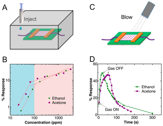 Gas sensing on the fabricated sensor was first tested in a sealed box, as shown in Figure 4A, where different amounts of ethanol and acetone were injected into the box. Figure 4B shows the log–log plots of the response of the sensor to different concentrations of ethanol and acetone. For both gases, a linear region was observed at concentrations below 100 ppm, followed by another linear region. The linear region at low concentration has a higher sensitivity (greater slope), which is due to the absorption of the gas molecules on the ZnO nanowires, changing the Fermi level dramatically. However, the change is not significant at higher concentrations. The detection limits in our experiment were 28 ppm for ethanol and 22 ppm for acetone. Such detection limits are close to those of the state-of-the-art room-temperature ethanol and acetone sensors [20,21]. The concentration of the gases was calculated using Equation (1) [22]: