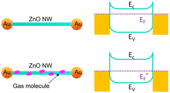 The mechanism (Figure 5) behind the gas sensing is the decrease in the Fermi level of the ZnO nanowires due to the absorption of gas molecules, which changes the Fermi level at the contacts of gold and ZnO, leading to the increase of the electrical resistance. In the Au–ZnO (M-S)n network, all ZnO nanowires that effectively contribute to the gas sensing are connected with two gold particles. Therefore, the summary of all the responses of the ZnO nanowires leads to a significant resistance change of the sensor and thus detection sensitivity. Such room-temperature gas sensing has a different mechanism from gas sensing at high temperature [18,23,24,25]. At high temperature, the reaction of gas molecules with the absorbed oxygen at the ZnO surface dominates the signal generation. At high temperature, the absorbed oxygen forms O− [25], which can react with ethanol or acetone. At room temperature, the reaction of gas molecules occurs less because the absorbed oxygen is not in the form of O−; therefore, the signal change is considered mainly due to the absorption of the gas molecules on the ZnO nanowires, which leads to the change of the Fermi level, which is an important factor of the performance [23] of our sensor.