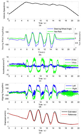 Figure 8 shows the experimental results of DLC maneuvering. Figure 8a shows the vehicle speed during the test, and in Figure 8b represents the steering wheel angle and yaw rate of the vehicle by the blue line and green line, respectively. Figure 8c shows the longitudinal and lateral accelerations of the vehicle, and the maximum lateral acceleration is between 8 and 9 . The estimated aligning torques of the left and right kingpins are shown in Figure 8d. Figure 8e shows the estimated lateral distance between the vehicle and the lane line, and the estimated value tracks the reference value with little error. The road friction coefficient estimation results are shown in Figure 8f. If the reference value of the road friction is considered as 0.8, then the estimation accuracy was about 97.8%. Since the nonlinear estimator only works during steering, the estimation holds if the vehicle’s lateral acceleration is relatively small during DLC, for example, from 7 to 8 s. Compared with the slalom test results, the road friction estimation results dose not fluctuate because the lateral excitation is not continuous. From the experimental results, we can see that the road friction coefficient rapidly converges to the reference value.