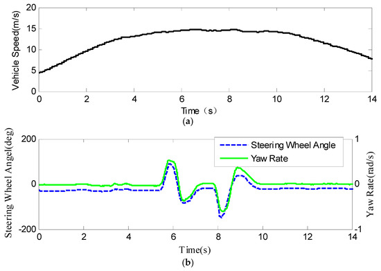The test vehicle is an electric vehicle and shown in Figure 5a, and the vehicle parameters are listed in Table 1. Information about the wheel speed and steering wheel angle was obtained through CAN-Bus. The GNSS receiver is Novatel 718D, which provides the absolute position and heading angle of the vehicle. It is necessary to point out that the lane lines were modeled in advance in the navigation coordinates so that the distance between the vehicle and lane line could be calculated in real time. ADIS16495 is the IMU (Inertial Measurement Unit), which measures the acceleration and angular velocities. The angle between the vehicle heading and lane line can be calculated by integrating the yaw rate of the vehicle. The steering tie rods are cut off and two Kistler tension and compression force sensors 9321B are installed on the left and right tie rods, respectively, as shown in Figure 5b. The tension and compression force sensors measure the force at the tie rods so that the self-aligning torque of the wheel can be measured indirectly.