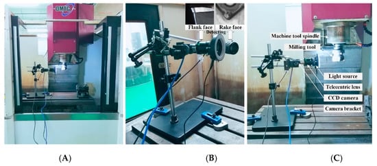 Experimental environment for milling and tool wear detection. (A,C) Actual detection images; (B) The overall image of camera bracket.