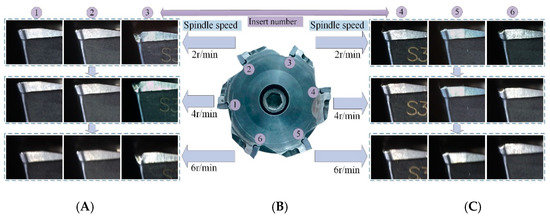 Process of matching the camera frame rate with the machine spindle speed. (A,C) Images of different numbered inserts at different speeds; (B) numbered picture of inserts for face milling cutter.