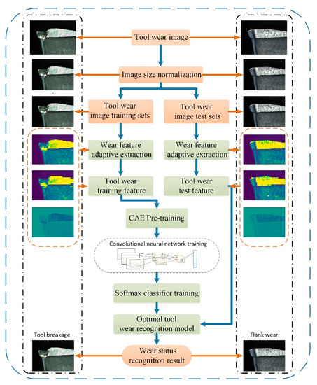 The images of tool wear are the datasets after the image size normalization. Wear characteristics of tool wear images are extracted adaptively, some are used as the training data, and the other part is used as the test data. After the network model is pre-trained using a convolutional automated encoder (CAE), the output is set as the initial value of the CNN parameters. CNN is used to continue the training to obtain the optimal solution of the entire network parameters. Finally, the softmax classifier is used to identify and classify the wear types of milling tools. The whole network structure continuously iterates and feeds back the actual error results of the calculation. At the same time, the weight of the network is updated to make the whole network develop in the optimal direction, and the optimal wear type identification model is obtained finally. The overall process for tool wear identification is shown in Figure 3.