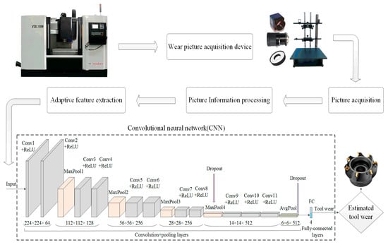 Relative to the convolutional layer, the full connection layer has more connections, and more parameters will be generated. In order to reduce the network parameters, only one fully connected layer is set in the model, and the last pooling layer in front of the fully connected layer is set to the mean pooling layer. The kernel size of the mean pooling layer is 4 × 4. This configuration can effectively reduce network parameters while maintaining network feature extraction capabilities as much as possible. The acquired image size of the tool wear image is 256 × 256 × 3 and randomly cut into a uniform 224 × 224 resolution as the input data of the network model. The tool wear images are divided into four categories according to the wear types, and the fully connected layer is set as four types of output. The framework of tool wear identification method and network structure based on CNN are shown in Figure 4.