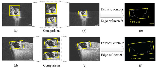 Comparison of detection methods for the value of tool wear. (a,d) Roughly processed images of adhesive wear and sheet peeling; (b,e) cropped images; (c,f) edge refined images.