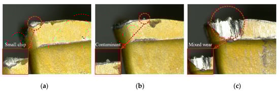 Images of the detection error cases. (a) adhesive wear, (b) flank wear, (c) multiple wear coexist.