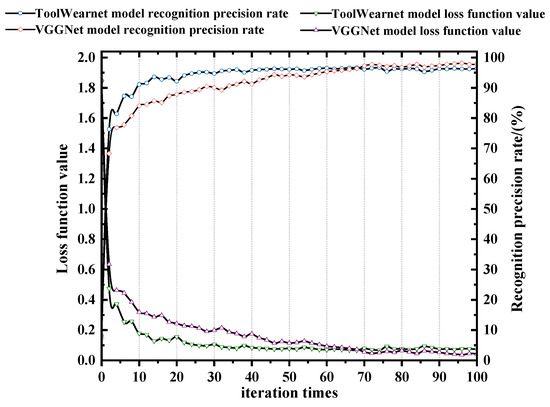 In order to reflect the reliability of the ToolWearnet network model built in this paper in tool wear types identification, and to make a reasonable evaluation of its recognition precision rate and efficiency, the VGGNet-16 network model was applied for the comparative experiment. VGGNet-16 is a CNN model developed by the VGG (visual geometry group) group of Oxford University for image classification. The VGGNet-16 network model has a 16-layer network structure with 5 maximum pooling layers, 13 convolutional layers, and 3 fully connected layers. The convolution kernels are all 3 × 3, and the pooling kernels are all 2 × 2. The first and second fully connected layers use dropout technology, and all hidden layers are equipped with ReLU layers. The model has strong image feature extraction ability. The detailed training parameters for the two models are shown in Table 6. After training and testing, different recognition precision rate and loss function values are obtained, as shown in Figure 9. The comparison of the precision rate of the recognition, training time, and recognition time of the different tool wear by the two models are shown in Table 7.