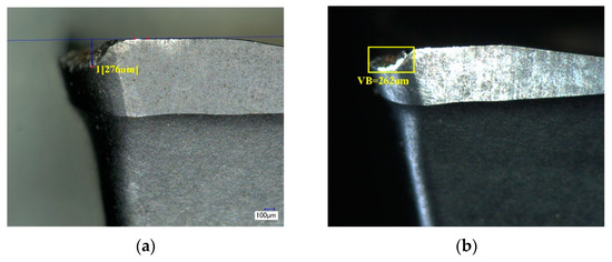 The tool wear and tool failure in the milling of high superalloys are analyzed as an example. The tool wear is severe due to high hardness, excellent fatigue performance, and fracture toughness of superalloys. At a lower cutting speed, flank wear and rake face wear are the main forms of wear, as shown in Figure 6a,d; at a high-speed cutting, the heat generated causes significant chemical and adhesive wear on the tool, as shown in Figure 6c. In actual cutting, the wear form is often complicated, and multiple wears coexist. For example, flank wear and crater wear (rake face wear) can be observed simultaneously, and two wears that interact with each other will accelerate the wear of the tool and finally lead to breakage, as shown in Figure 6b. The adhesive wear at the edge will cause chips to adhere to the rake face, and finally, the sheet peeling will occur at the edge.