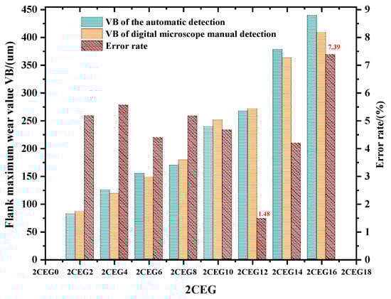In the experiment, the spindle speed was matched with the frame rate of the camera, and the wear image of each insert on the face milling cutter was collected. Each acquisition took the corresponding insert directly below the label on the cutter as the starting point and sequentially numbers the six inserts in the direction while the tool rotates. The images with good quality and complete tool wear areas were acquired by filtering by the fuzzy and the insert position detection. Then, the flank wear value of each insert was obtained by the ATWVD method combined with the CNN model. After the automatic acquisition of the tool wear image, the inserts are detected by a high precision digital optical microscope to obtain the exact value of tool wear after stopping the CNC machine. The comparison of the pictures collected in two ways is shown in Figure 10. We randomly selected one set of tool wear images with complete tool wear life cycle in the test set for comparison, taking “2CEG” as an example. The maximum wear value VB of the ATWVD method detection and high precision digital microscope manual detection and the error rate of the ATWVD method were obtained, as shown in Figure 11.