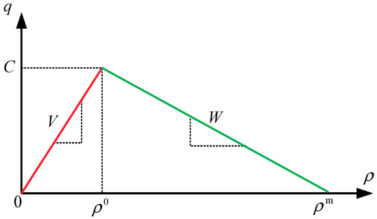 In the model, the triangular fundamental diagram is used to approximately describe the relationship between the traffic flow and the density of the road segment (cell) (see Figure 1), where ρ is the traffic density (vehicles per kilometer), q is the traffic flow (vehicles per hour), C is the traffic capacity (vehicles per hour), V is the free flow speed (kilometers per hour), W is the traffic wave speed (kilometers per hour), ρ 0 is the critical density (vehicles per kilometer), and ρ m is the maximum/jam density (vehicles per kilometer).