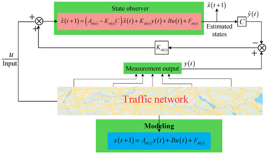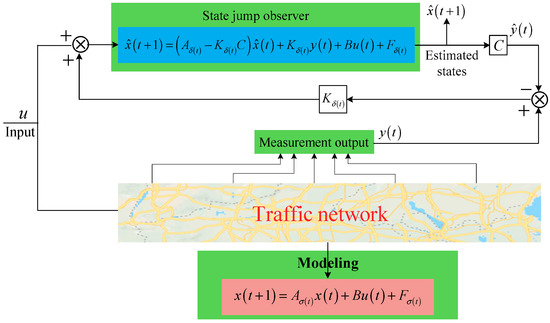 For the convenience of design and computing, an important assumption is essential in the traditional switched observer design—the switching of the observer and the switching of the system are synchronous. However, strict synchronization is impossible for the real traffic network, thus this assumption does not hold. As a result, a novel structure observer, which is called state jump observer, is proposed. The structure diagrams of the switched state synchronous observer and the switched state jump observer are shown in Figure 2 and Figure 3, respectively.