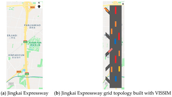 Figure 4. Experimental road section. (a) Jingkai Expressway; (b) Jingkai Expressway grid topology built with VISSIM.