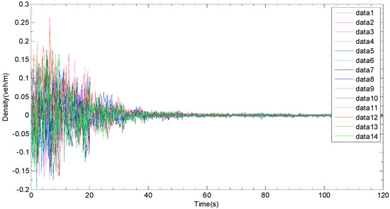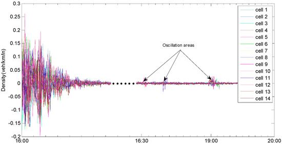 In order to reduce the complexity of observer design, the mode changes are ignored in the previous method, and thus jumps and oscillations disappear. However, in our method, in order to reconstruct the real densities more accurately, we consider the mode changes. Compared to the previous method, the biggest difference is that the jumps and the oscillations appear when the mode changes occur in the error curve for the state jump observer. The main reason is that, when the new mode is updated, the error system is oscillated repeatedly from the initial state until it converges again—this is the essential attribute of the real traffic network. This attribute cannot be eliminated and can only be weakened by the corresponding approach optimization. Although the oscillations appear when the mode changes occur, the error system can stabilize quickly by using our method, and it does not affect the accuracy of the results; this is also the advantage of our method.