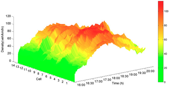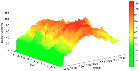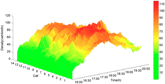 First of all, according to the actual road network structure, the experiment road section is reconstructed by using the traffic simulator VISSIM (see Figure 4b). In order to reconstruct the traffic densities of all the cells, the traffic flow evolution process from 16:00 to 20:00 is then further simulated. The sample time interval is 5 s. Because there are three on-ramps and two off-ramps, the corresponding dimensions of the input matrix B are 14 × 3, and b2,1 = 0.0203, b8,2 = 0.0192, b14,3 = 0.0192, and others are 0.