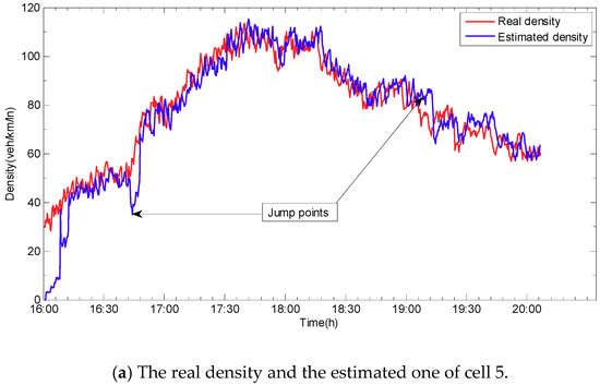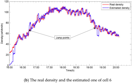 Compared to the synchronous state observer, the biggest difference is that the jumps and the oscillations appear when the mode changes occur in the error curve for the state jump observer (see Figure 8). The main reason is that, when the new mode is updated, the error system is oscillated repeatedly from the initial state until it converges again. The estimated densities, which are shown in Figure 9, exhibit that the densities can be reconstructed by using the state jump observer and that jumps only occur where the new models are updated. Figure 10 demonstrates the more detailed estimation results of cell 5 and cell 6. From the estimation results, the congested area and the congested period of the expressway can be easily identified. Thus, it can provide basis for residents to avoid traffic congestion and improve the road operation efficiency.