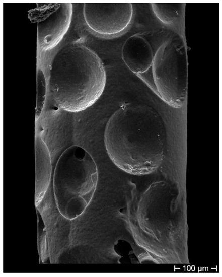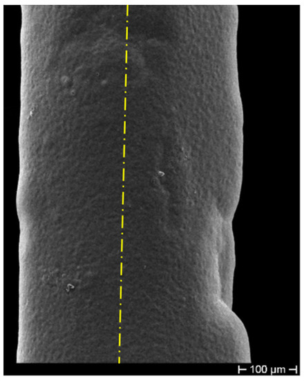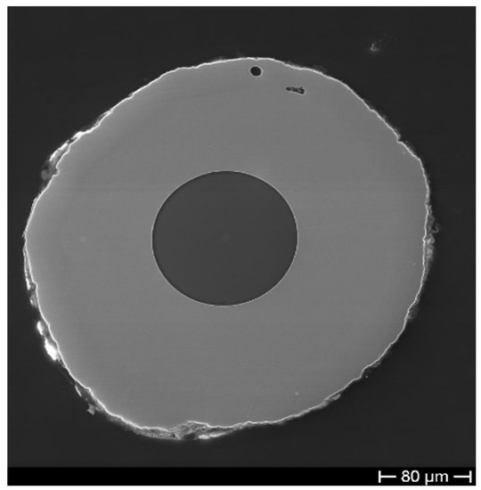 The fibers were first gilded on a stripped segment of about 50 mm in length, by means of sputtering (using an EDWARDS sputter coating, model S150B) to make the cylindrical surface electrically conductive. The gilded segment (cathode) was then subjected to ED using a custom cylindrical lead (Pb) anode submerged in the electrolyte within a cylindrical glass cell. The fiber stayed positioned along the vertical axis of the cell, slightly stretched. The controlled geometric arrangement allowed obtaining ED with uniform thickness on the cylindrical surface of the fiber. This configuration was adopted to obtain the most homogeneous radial deposition, trying in this way to avoid any anisotropy in the coating (as shown in Figure 1) and consequent non-isotropic radial stress, which can affect the grating spectrum, inducing disturbance in its behavior. Figure 1 highlights, as a consequence of a non-axial position of the cathode not perfectly aligned to the longitudinal axis of the cylindrical Pb anode (that is shown as a yellow dash-dotted line), an optical fiber with non-homogeneous thickness. The sulfate solution used as an electrolyte for the Cu ED in both coatings (bimetallic Cu–Ni layer and single metallic Cu layer) contained 25 g/L of Cu as and 20 g/L of , while the electrolyte for Ni ED contained 40 g/L of Ni as and 10 g/L of (boric acid). The metal ED was performed for both metals at a current density of 250 A/m at RT using an Amel galvanostat, model 2053. Many samples produced during the ED trials also showed surface irregularities, as shown in Figure 2, probably due to the presence of hydrogen bubbles during Ni ED, given that Ni catalyzes the discharge of hydrogen. These hydrogen bubbles insulate the surface of the sample, preventing the deposition of more metal and generating these concave formations. Considering that the thickness is very thin, these hydrogen bubbles, although located on the surface, affect a significant volume of the coating and make it irregular, thus exacerbating the nonhomogeneous transfer of even the slightest external stress and consequently giving rise to unstable FBG spectral response.