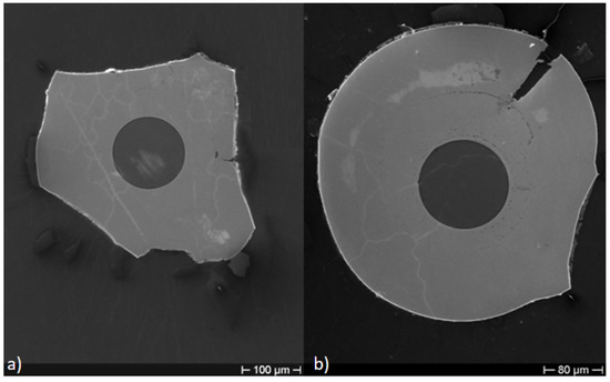 As mentioned before, the reason for coating execution is the mechanical protection of the fiber during the RP, but in turn, during such a critical thermal cycle, the metal coating is also subjected to severe thermal conditions. While during a traditional RP, the samples are exposed to HT in very long periods, and with very soft heating ramps, in this test campaign, the samples were stressed by much more critical conditions, with steeper heating rates, i.e., with the highest temperatures reached faster. To analyze the effect that the HT could have on metal coatings and that consequently could critically affect the grating spectral response, both sets and respective dummies underwent HT cycling in a tubular laboratory furnace, with temperatures ranging from RT to 800–1010 C for the bimetallic coating samples. Cycling from RT to 700 C was used for Cu-coated fibers, because of the lower melting temperature of copper. Table 1 describes which thermal cycles have been performed and on what set of samples. Dummy samples were analyzed using a scanning electron microscope (HITACHI, Tokyo, Japan, model S2500) equipped with EDS analysis.