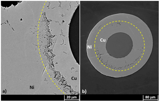 Figure 3 shows the cross-section of Cu–Ni samples with different Cu layer thickness, after thermal cycling at 800 C, but without a previous recovery. Various tests were performed on the Cu–Ni samples, varying the deposition time of the Cu, until identifying the most suitable time for the subsequent deposition of Ni in 240 min. In particular, in Figure 3a, the Cu layer was obtained with 90 min of ED, while the Cu layer of Figure 3b was obtained with 120 min of ED. It is clearly shown in Figure 3a (with minor Cu thickness) that the external Ni portion is seriously compromised, while the sample of Figure 3b where the Cu thickness is greater maintains a better aspect.