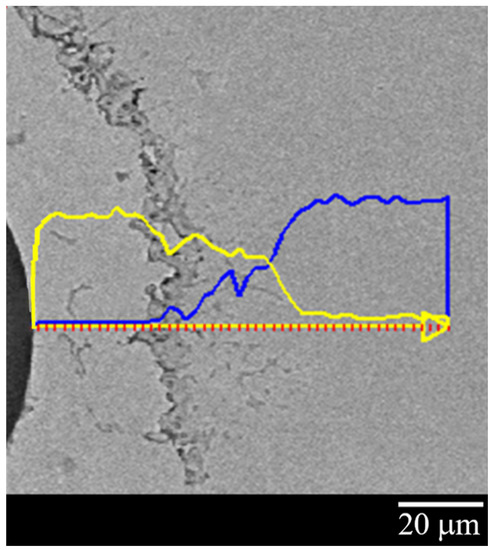 The line analysis (Figure 6), carried out on a Cu–Ni dummy sample cross-section, shows qualitatively the Cu (yellow line) and Ni (blue line) distribution along the coating thickness and validates what was reported above. The line analysis clearly shows how, starting from the fiber and moving horizontally from left to right, one can find only Cu, for about the first 30 microns, until the appearance of what has been identified as the KV area (about 5–10 microns wide); then there is a Cu–Ni alloy interdiffusion zone (about 35 microns wide) with a high concentration of Cu, excluding a few microns near the only-Ni zone, that is, at the right side of the image. Figure 6 also shows that KVs are located in the Cu layer, as already demonstrated in [22,23].