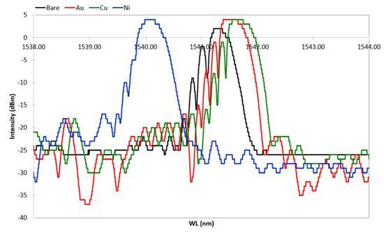 After gilding (in red in Figure 7), the spectrum shows a slightly larger Bragg peak value and side lobe suppression (SLS, i.e., difference between the Bragg peak and side lobe peaks). Further, a shift toward larger wavelengths can be seen, indicating that gilding produced some elongation (axial tension). Similarly, the spectral response of the FBG shows that both the peak value (power) and the noise floor increased; the impact on the signal–noise ratio SNR is ambiguous, but it was not investigated, though it may be worth future study. After Cu ED (in green in Figure 7), the spectrum suffers insignificant variations. The Bragg peak has a minor shift toward larger wavelengths, indicating that an elongation occurs. In contrast to this, after Ni ED (in blue in Figure 7), the spectrum experiences a broad shift toward lower wavelengths, maintaining the same power, whereas a large SLS suppression—present at lower wavelengths—occurs. Thus, it seems that the thickness growth affects the signal sensitivity, giving minor spectrum variation due to the background noise, improving the shape of the Bragg peak, increasing its power, and improving the sensor mechanical strength. On the whole, a large wavelength shift occurred after Ni coating (from about 1541.7 nm to 1540.1 nm), indicating that a large axial compression took place, although the spectrum shape and power of the peak remained constant. The spectral variation is dependent on the quality of the deposit, because an irregular deposit produces non-uniform radial and longitudinal stress and consequent strain. Spectra in Figure 7 show that the coating does not introduce nonhomogeneous radial or longitudinal strain on the grating (coating has good concentricity). In fact, neither birefringence (doubling of the Bragg peak) nor diffraction dispersion (broadening of the Bragg peak) occurs. The main effect is an appreciable wavelength shift with quasi-unchanged spectral shape, which can be fully explained by a homogeneous axial contraction or elongation of the Bragg grating after each step of the coating production. One more effect to be noted is a reduction of the relative amplitude of the secondary lobes at lower wavelengths, which causes a slight reduction of the full width at half maximum (FWHM) of the main peak.