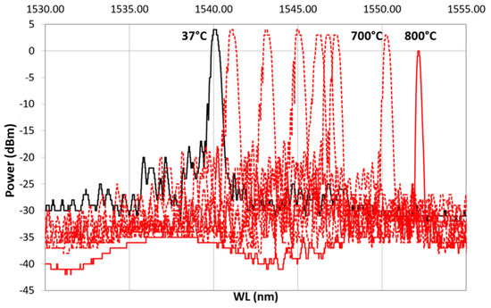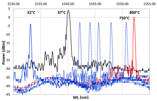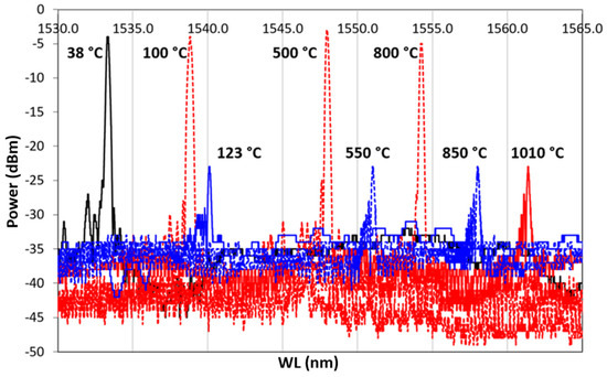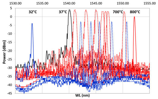 After ED, FBG samples underwent preliminary recovery treatment followed by thermal cycling as a final proof test (Table 1), monitoring the spectral variation. Thermal cycling was done with a heating ramp (from 37 to 800 C) followed by a cooling ramp (from 800 to 32 C). Figure 8 shows the result from one of the samples: dotted red line, spectra from the heating ramp; dotted blue line, spectra from the cooling ramp; solid black, spectrum at 37 C, at the beginning of the heating ramp (after the hydrogen recovery); solid red line, spectrum ad 800 C; solid blue line, spectrum at 32 C at the end of the cooling ramp. In Figure 8, labels on top of some selected spectra specify the temperature at which the spectra were recorded. As shown in Figure 8, as the temperature increases, the reference spectrum begins to shift to the right.