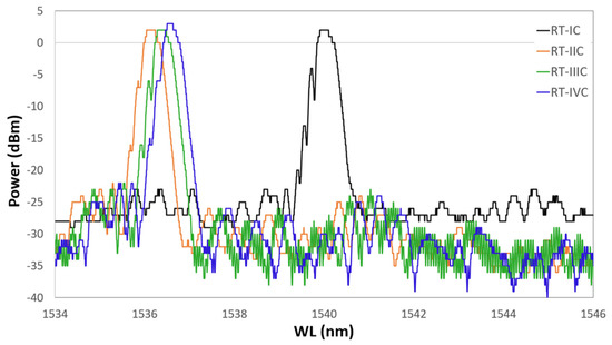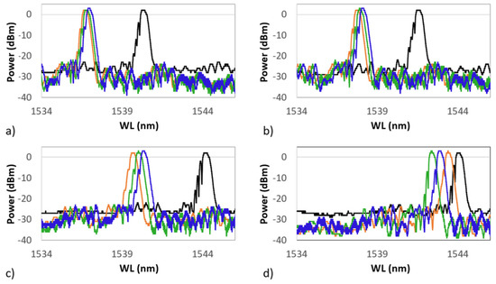 The four graphs of Figure 13 show how, following the first thermal cycle (always shown in black in Figure 12 and Figure 13), the grating maintains a more coherent behavior in the three following cycles. At 100 C (Figure 13a) , 300 C (Figure 13b), and 500 C (Figure 13c), the spectrum moves proportionally to the right (increasing wavelength) as a result of the heating. At 700 C (Figure 13d), the sensor spectra tend to group themselves around the same wavelength (around 1543.00 nm). This effect could be ascribed to the strongly nonlinear behavior of the photoelastic coefficient at HT. This test demonstrates that in the same range of temperatures, and in the absence of the second metal, the anomalies detected in the presence of the second metal (as in the case of the Ni–Cu bimetallic coating) are not registered and that there are no detachments at the interface between optical fiber and metal coating. This would also confirm the behavior shown in Figure 8 and Figure 10, where the last recorded WL (at 32 C) was moved much further to the left than the RT value preceding the thermal cycle (at 37 C).