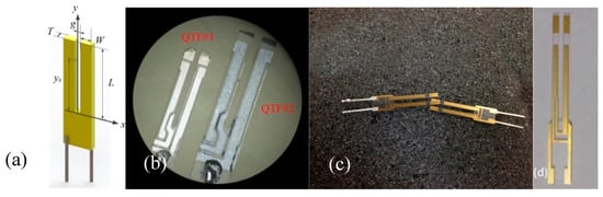 The realization of QTFs was originally developed in the 1970s. Usually, commercial QTFs are etched using microelectronic clean room techniques starting from hundreds of micrometer thick Z-cut quartz wafers [21], with QTF prongs oriented along the y-axis, see Figure 1a. The electrodes, made of silver or gold, are deposited on adjacent sides of the prongs of the QTF. When one of the in-plane flexural modes is excited, the two prongs vibrate in the QTF planes, namely, the xy-plane. A picture of two commercial QTFs, named QTF#1 and QTF#2, employed in this work is shown in Figure 1b. For custom QTFs, a Z-cut quartz wafer with a 2˚ rotation along the x-axis was selected and standard photolithographic techniques were used to etch the QTFs. Chromium and gold patterns were photolithographically defined on both sides of the wafer. A three-dimensional structure was generated by chemical etching in a hydrogen fluoride solution, and finally the side electrodes were deposited by means of shadow masks [21]. A picture of two custom QTFs, named QTF#3 and QTF#4, is shown in Figure 1c,d.