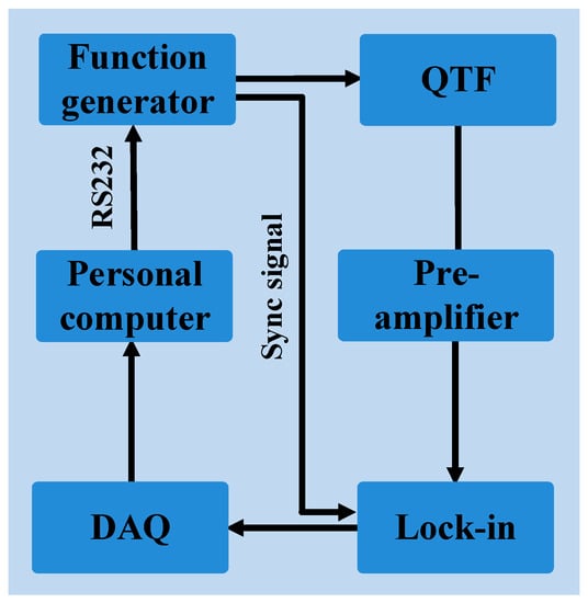 where E and ρ are the Young modulus and the density of quartz, respectively. The resonance frequency, as well as the quality factor and the electrical resistance of the QTFs, can be experimentally measured by electrical excitation, using the setup depicted in Figure 2.