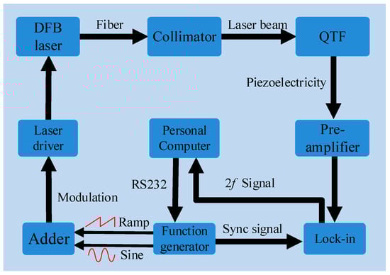 In this section, a QEPAS sensor system for water vapor detection was described. The laser beam focus position between two QTF prongs as well as the laser modulation depth were investigated in detail to optimize the sensor performance. The schematic diagram of the experimental setup is depicted in Figure 3.