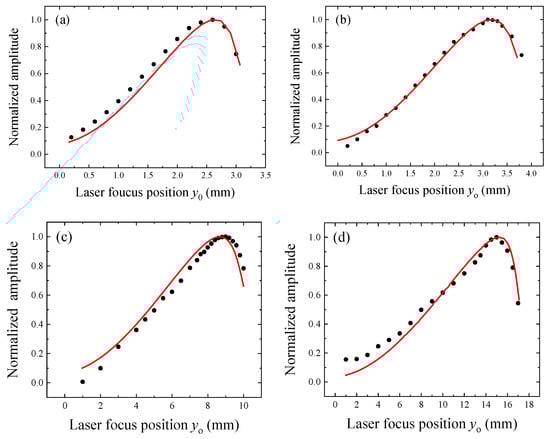 (a–d) Normalized QEPAS signal amplitudes as the function of laser focus position y0 measured for QTFs #1 (panel a), #2 (panel b), #3 (panel c), and #4 (panel d). Black dots represent the experimental data and the red lines represent the theoretical curve calculated by the numerical method.