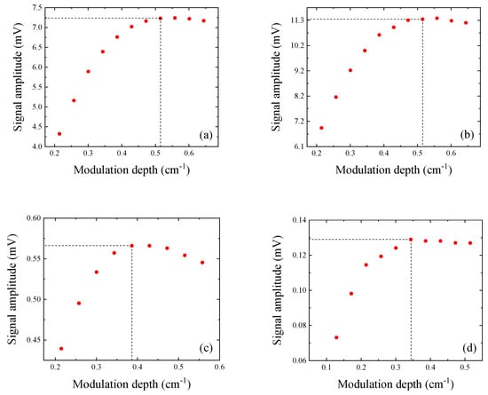 When the wavelength modulation approach is used, the modulation depth describes how much the laser wavelength varies around its mean value. According to the theory of wavelength modulation spectroscopy, the laser modulation depth maximizing the QEPAS signal should be optimized for each laser current modulation frequency [23]. Hence, the laser wavelength modulation depth was varied from 0.2 cm−1 to 0.6 cm−1 for each employed QTF, by varying the current modulation amplitude. The 2f-QEPAS peak signal as a function of the modulation depth is reported in Figure 5, for all investigated QTFs.