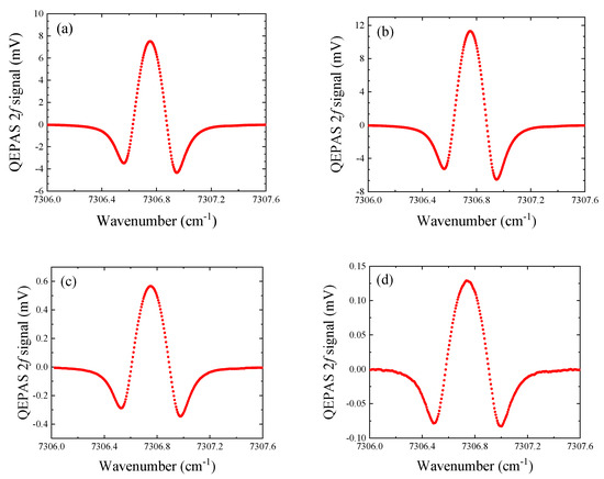 Optimized 2f QEPAS signals. (a–d) QTF#1, #2, #3, and #4, respectively. The laser wavelength was targeted at the 7306.75 cm−1 H2O absorption line.