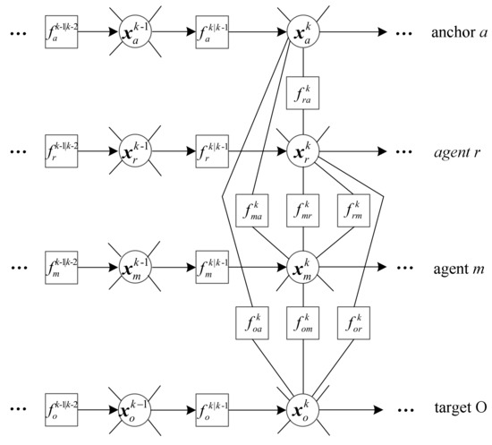 For convenience of description, we define ( for anchors and for agents) to represent all nodes who can detect target at the kth time slot. Similarly, let denote all nodes from whom node can implement ranging measurement at the kth time slot. Typically, notation represents all targets that node m can detect at the kth time slot. Moreover, we denote the position variables of all nodes by , the ranging measurements of node by , and the ranging measurements of target by , respectively. Then, let and represent the position variables of all nodes and ranging measurements at the kth time slot, respectively. Furthermore, let denote the position variables of all nodes from the 0th time slot to the kth time slot and denote the ranging measurements from the 1st time slot to the Kth time slot, respectively.