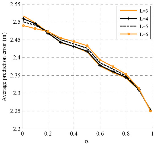 The performance of the proposed adaptive prediction model with different numbers of historical estimated positions and is illustrated in Figure 2. Simulation configurations are as follows. For the GM mobility model shown in Equation (31), we set and . For the prediction using Equation (13), the parameters are and . As we know, the prediction algorithm is based on the historical estimated positions. In initialization, we use the true positions along with Gaussian noise (mean = 0 and variance = 4 m2) as the estimated positions. As shown in Figure 2, there is little difference in the average prediction error using different historical positions with different . Comparatively speaking, when the value of is smaller, more historical positions are used and the more accurate the obtained prediction is; when the value of is bigger, more historical positions are used and a more accurate prediction is achieved. This is because a smaller value indicates a greater randomness of motion, therefore the impact of the (k−1)th time slot on the kth time slot is less. More historical positions can reflect the trend of the movement. However, a bigger value leads to a stronger correlation between the kth time slot and the (k−1)th time slot. In this situation, the contribution of the earlier time slots to the current moment is small, and using too much historical information even influences the accuracy of prediction. Moreover, greater the number of historical positions used, the more information the nodes store and the greater the energy consumption. In subsequent simulations, we use three historical positions, meaning each node stores three historical positions.